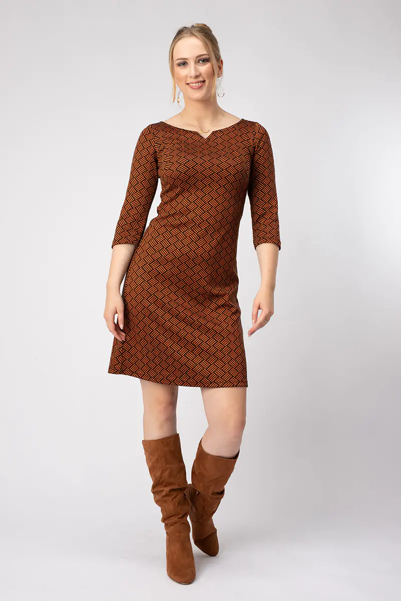 Kleid AUDREY zeichnet sich durch einen geradlinigen Schnitt in leichter A-Form aus. Der Halsausschnitt ist oval mit einem dekorativen „V“ in der Mitte.