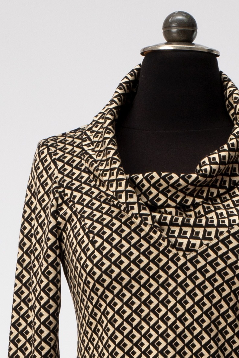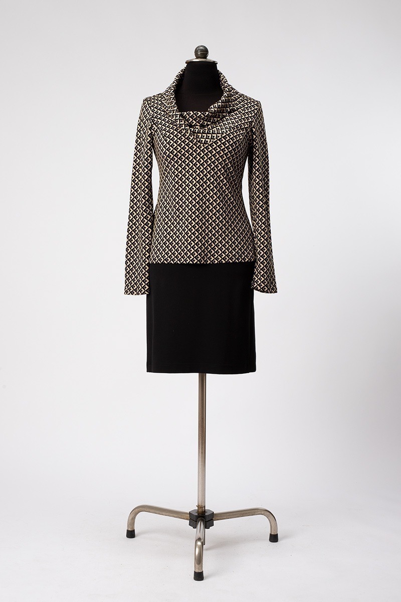 Der weiche, asymmetrische Kragen ist außergewöhnlich dekorativ und natürlich auch wärmend. Der überlange Ärmel reicht bis auf den Handrücken und wird sogar großen Frauen gerecht. Das Shirt ist leicht tailliert und hat ein leichtes Schößchen. Kombiniere es mit unserem Rock TESSA oder mit einer Hose Deiner Wahl.