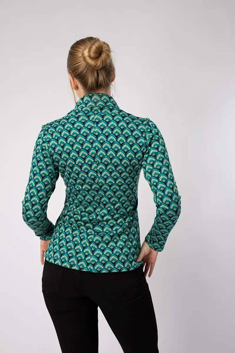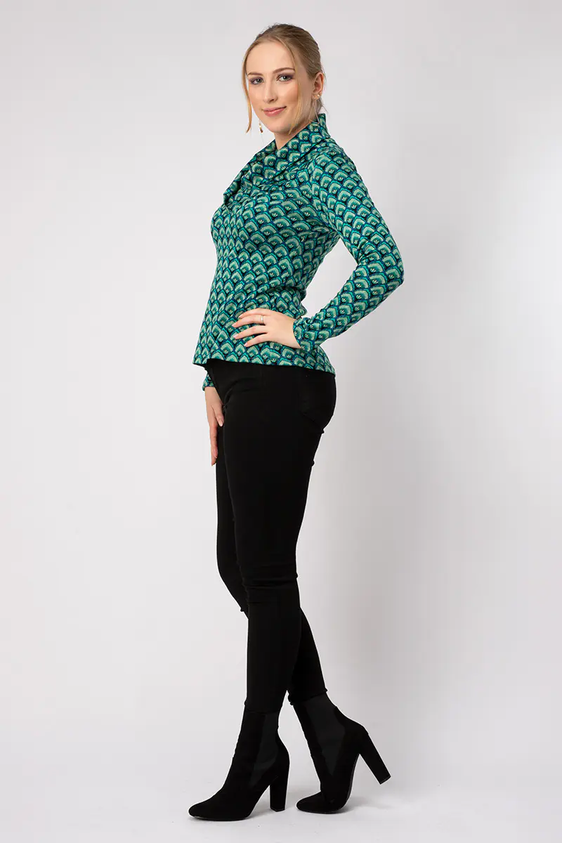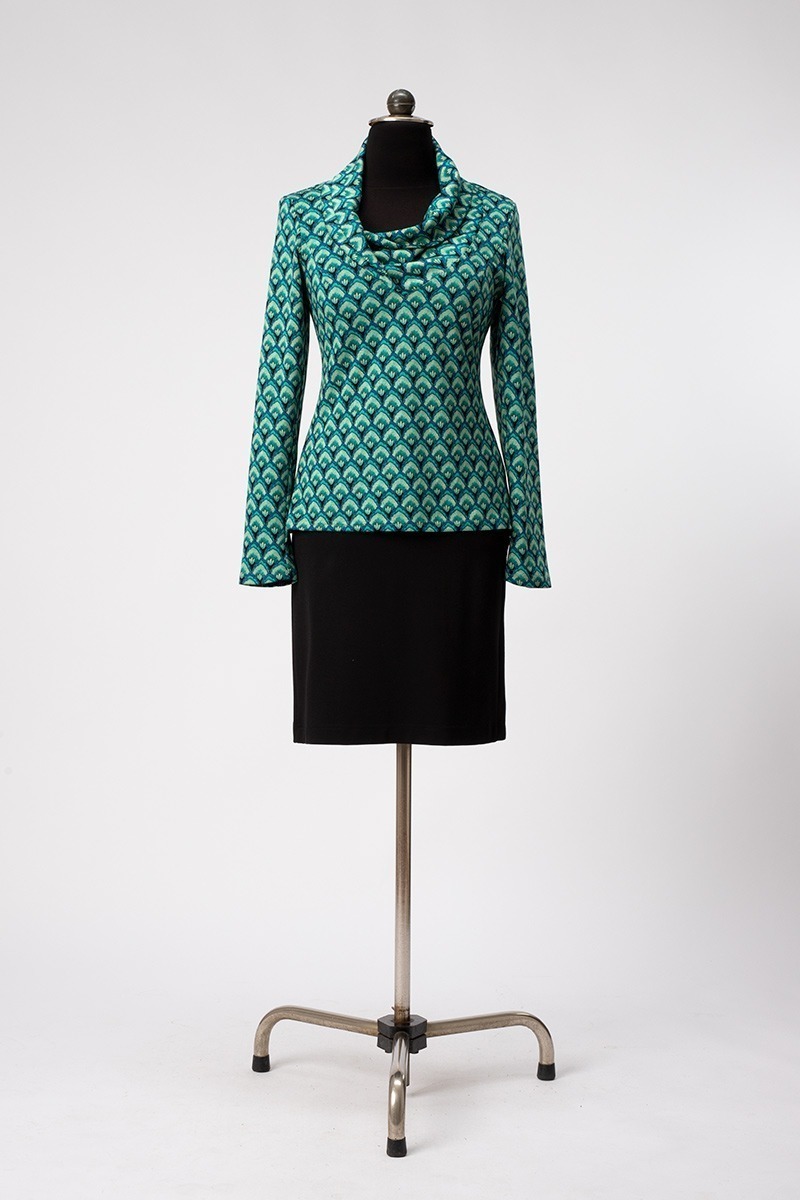 Der weiche, asymmetrische Kragen ist außergewöhnlich dekorativ und natürlich auch wärmend. Der überlange Ärmel reicht bis auf den Handrücken und wird sogar großen Frauen gerecht. Das Shirt ist leicht tailliert und hat ein leichtes Schößchen. Kombiniere es mit unserem Rock TESSA oder mit einer Hose Deiner Wahl.