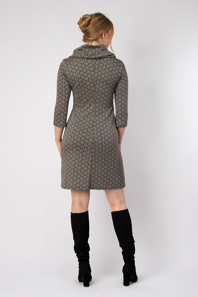 Es ist körpernah geschnitten und trotzdem super bequem. Der leicht ausgestellte Rock verleiht dem Kleid eine A-Silhouette. Der große, kuschelige Kragen ist dekorativ und wärmend. Innen mit einer Kontrastfarbe abgesetzt kann er spielerisch drapiert werden. Der Ärmel ist ¾-lang und am Saum leicht ausgestellt.