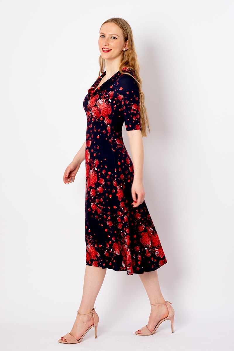 Unser Kleid Merle ist die entspannt feminine Freundin für den kleinen oder größeren Auftritt. Ob mit dezentem Print oder unifarben, Merle macht sowohl tagsüber als auch abends Freude und eine gute Figur. Die halblangen Ärmel und viel Weite in der Körpermitte schmeicheln den Kurven und die Midilänge streckt die Silhouette. Mit schwingendem Rock in A-Linie und weich fallendem Schalkragen glänzt sie auch beim Theaterbesuch oder der Geburtstagsfeier. Aus komfortablem Viscose-Jersey gefertigt ist sie immer bequem und pflegeleicht.
