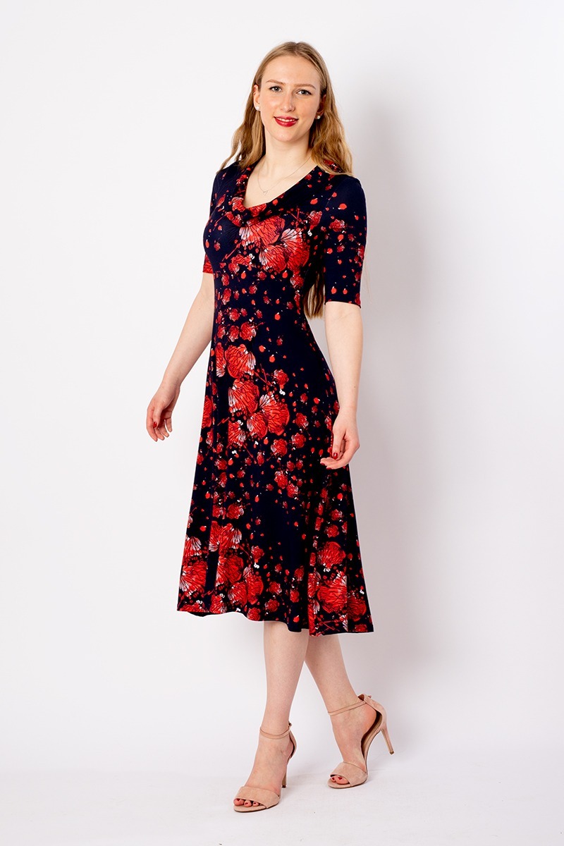 Exklusiver, eigener Print. RedFlakes – Rote Blüten auf dunkelblauem Grund.