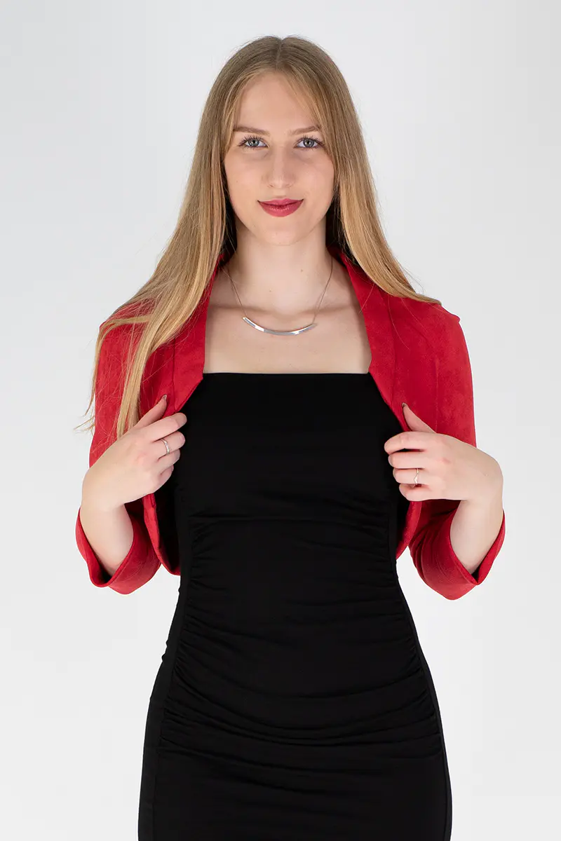 Der Bolero NELE ist wunderbar mit schmalen Jersey-Kleidern kombinierbar und kreiert durch seine schlichte Eleganz ein stilvolles Outfit.