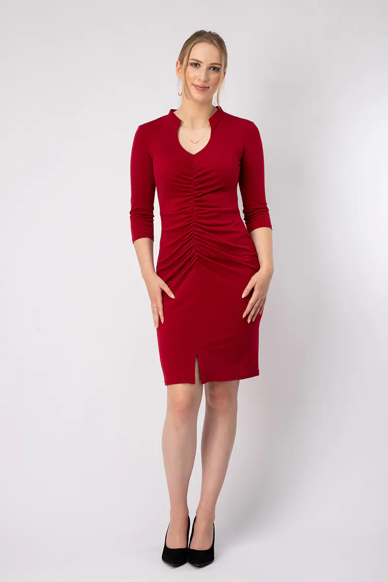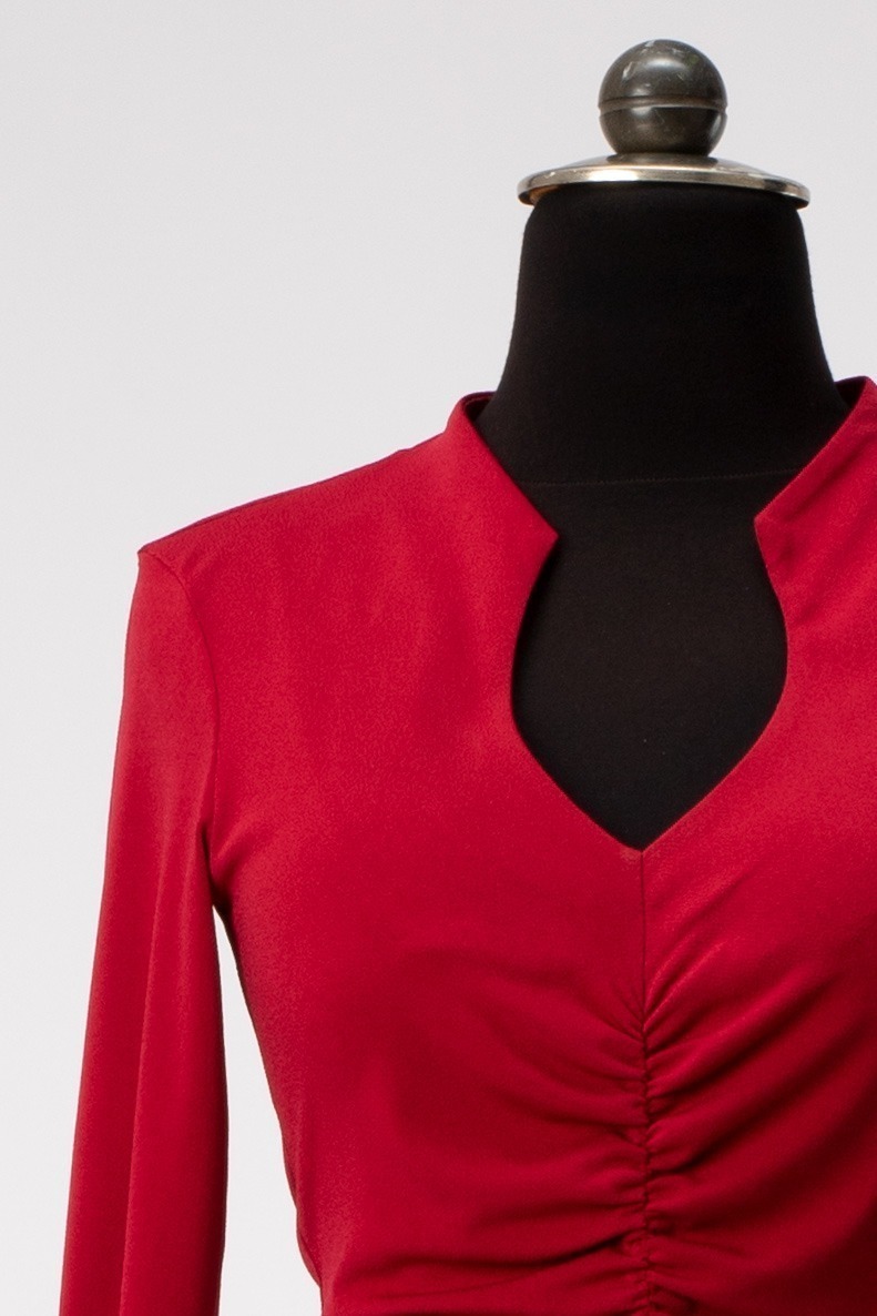 Es ist figurbetont aber nicht hauteng. Die Raffung im Vorderteil kaschiert gekonnt die eine oder andere weiblichen Rundung. Der Rock ist schmal und hat vorne einen Schlitz.